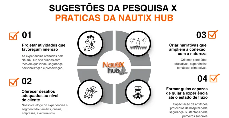Até uma experiência náutica da NautiX Hub ser disponibilizada na Plataforma, ela passa por etapas. Etapas estas que existem para que o estado de flow ocorra. Por exemplo: quando incluímos tecnologia (IA para recomendações personalizadas, UX intuitiva, etc) e treinamento de anfitriões (atendimento, hospitalidade, primeiros socorros, consciência ambiental), estamos criando o ambiente ideal para que cada cliente entre nesse estado psicológico o qual se encontra com emoções de satisfação, alegria, paz...flow.